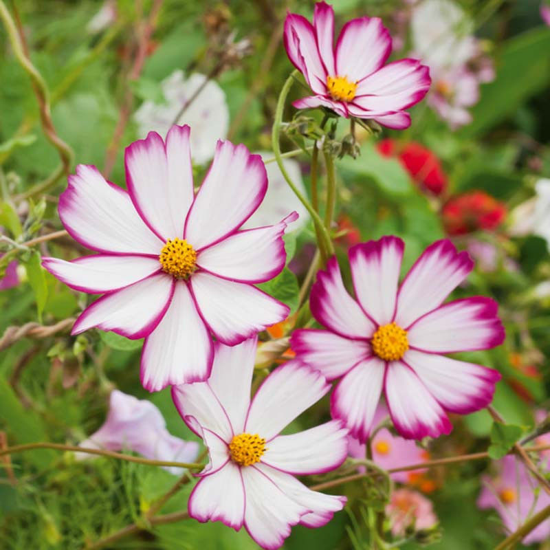 Cosmos Sensation Picotee is an annual border and cut flower plant, growing up to 110 cm tall. It showcases stunning white flowers edged with rosy red, making it a beautiful addition to any garden or floral arrangement.