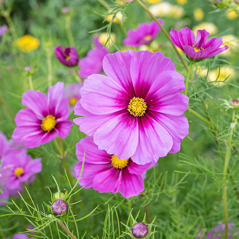 Cosmos Sensation Radiance is an annual border and cut flower plant, growing up to 110 cm tall. It features striking crimson flowers with a deeper crimson centre, adding vibrant colour to any garden.