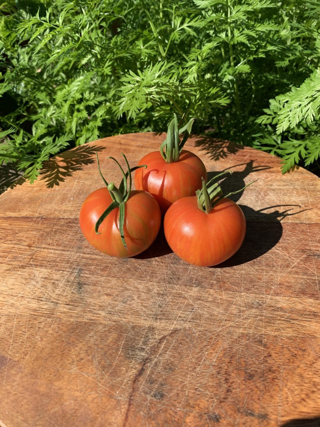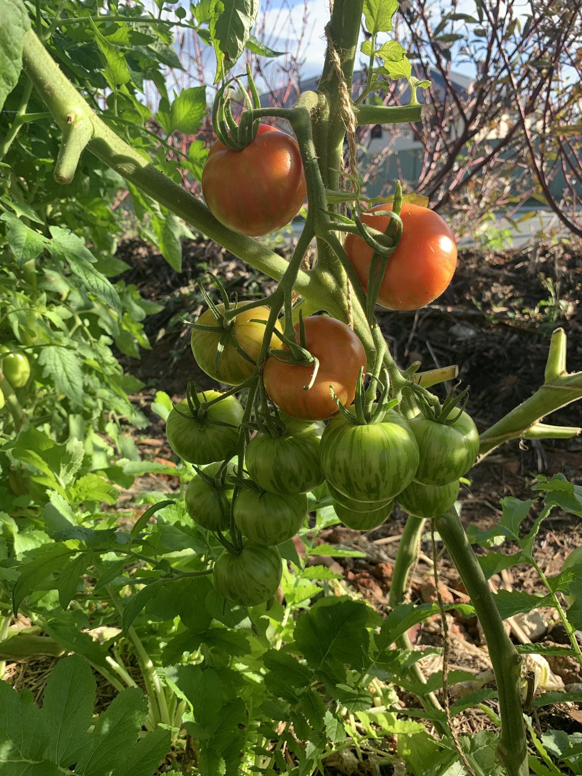 Indeterminate heirloom variety. Small to medium red fruit with stripes.